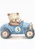 Dit Gemälde zeigt einen braunen Teddybären, der ein kleines blaues Vintage-Rennauto mit der Nummer 3 an der Seite fährt. Der Bär schaut geradeaus und hat seine Pfoten am Lenkrad.