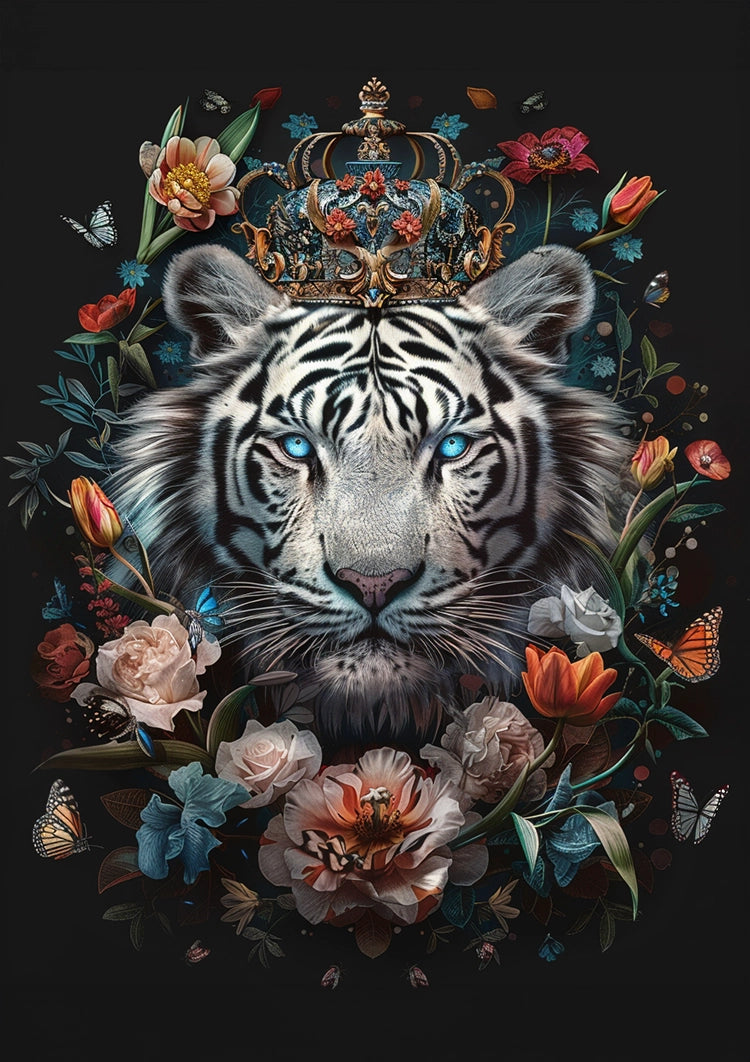 Dieses Gemälde zeigt einen weißen Tiger mit blauen Augen und einer mit Blumen verzierten Krone vor einem dunklen Hintergrund mit verschiedenen Blumen und Schmetterlingen.