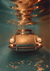 Dieses Gemälde zeigt ein Auto mit eingeschalteten Scheinwerfern, das vollständig unter Wasser in einer gefliesten Umgebung eingetaucht ist. Das Wasser verzerrt das Licht und die Reflexion, wodurch ein einzigartiger visueller Effekt entsteht.
