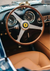 Dieses Gemälde zeigt das Interieur eines Vintage-Ferrari mit einem polierten Holz- und Metalllenkrad mit dem bekannten Ferrari-Emblem, vor einem Hintergrund aus klassischen runden Armaturen und cognacfarbenen Ledersitzen.