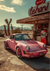 Dieses Gemälde zeigt einen vintage pinkfarbenen Porsche, der vor einer Retro-Tankstelle mit Schildern geparkt ist, umgeben von Wüstenlandschaft und Palmen unter einem klaren Himmel.