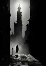 Ein schwarz-weißes Gemälde mit dem Silhouette einer Frau, dahinter ein Vintage-Turm.