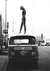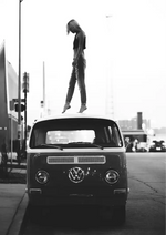Dieses Gemälde zeigt eine Person, die im Gleichgewicht auf einem Vintage-Volkswagen-Bus in einer Stadtstraße in der Dämmerung steht. Das Stadtbild im Hintergrund wird sanft von Straßenlaternen beleuchtet. Das Bild wird in Schwarzweiß festgehalten.