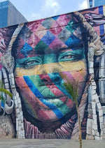 Ein Gemälde mit einem Wandbild eines Frauengesichts an einem Gebäude.