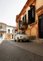 Dieses Gemälde zeigt einen vintage weißen Fiat 500, der in einer sonnenbeschienenen gepflasterten Straße in einer malerischen Stadt mit alten, rustikalen Gebäuden mit Holzläden und Balkonen geparkt ist.