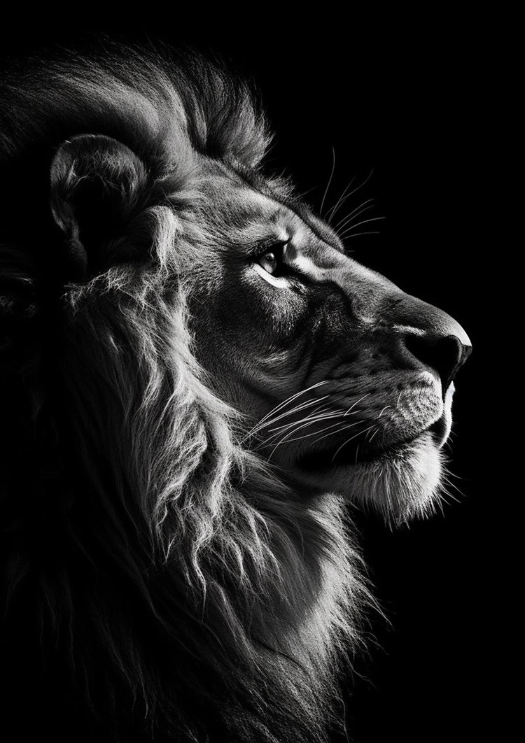 Dieses Gemälde zeigt ein schwarz-weißes Profilporträt eines Löwen mit Mähne, der zur Seite blickt. Das Bild betont die detaillierten Gesichtszüge und die Mähne des Löwen vor einem dunklen Hintergrund.