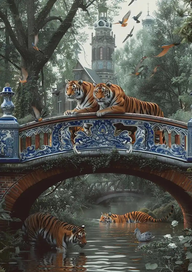 Op dit schilderij zie je een porseleinen brug omringd door tijgers.