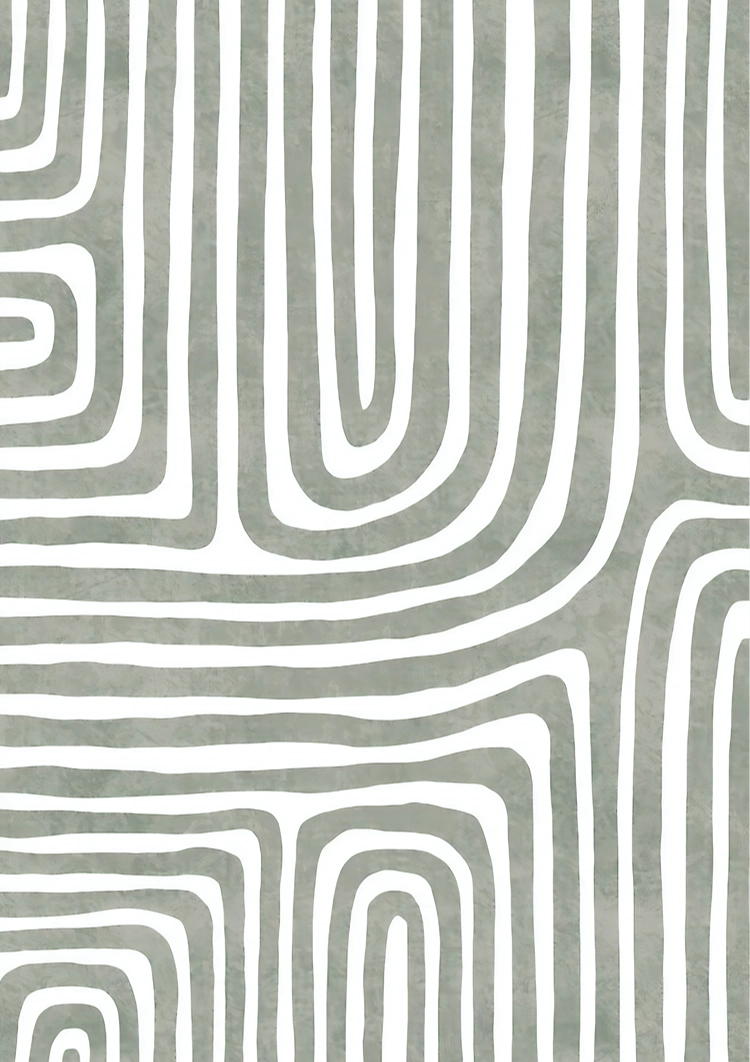 Abstract schilderij met ronde, doorlopende groene lijnen op een gestructureerde, gebroken witte achtergrond, waardoor een doolhofachtig patroon ontstaat.