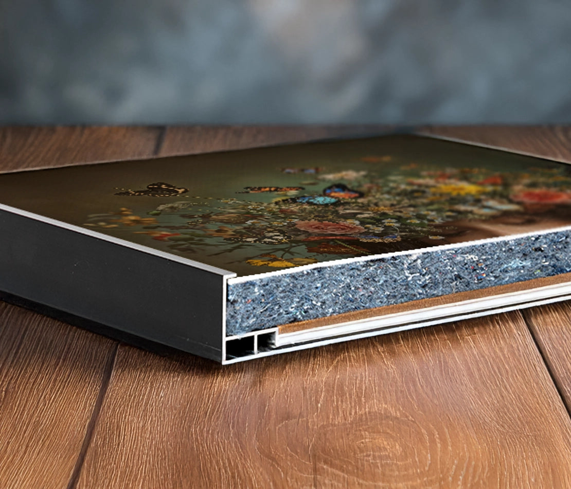 Het canvas heeft een dikte van 20 mm en 35 mm wanneer het is voorzien van een baklijst. Het schilderij wordt standaard geleverd met een ophangsysteem.