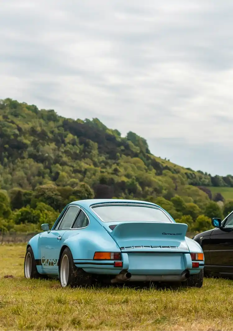 Een Baby blauwe Porsche 911 geparkeerd op een grasveld met glooiende heuvels op de achtergrond op een bewolkte dag. De auto is van achteren gefotografeerd.