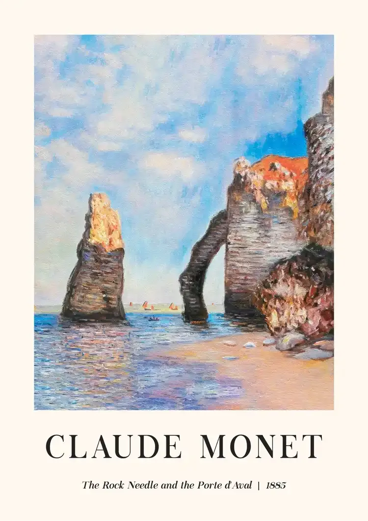 Dit schilderij van Claude Monet, "The Rock Needle and the Porte d'Aval" uit 1885, vangt een rotsachtig kusttafereel met een boog en een hoge, smalle rotsformatie tegen een blauwe lucht en een kalme zee, met zeilboten in de verte.
