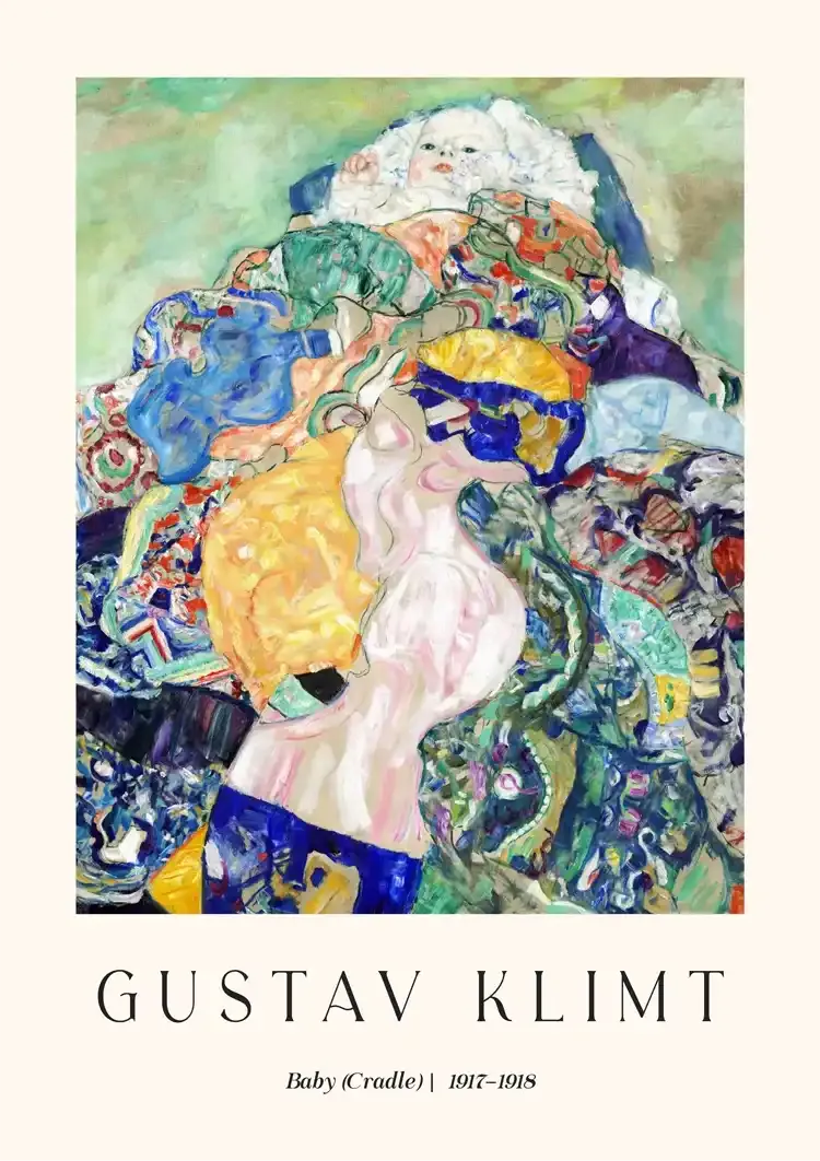 Dit schilderij, "Baby (Cradle)" van Gustav Klimt uit 1917-1918, toont een baby te midden van kleurrijke, abstracte vormen en patronen die typerend zijn voor Klimts stijl.