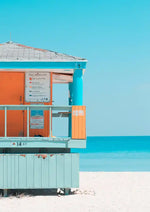 Dit schilderij toont een feloranje en blauwgroen huisje op een zandstrand onder een heldere blauwe hemel.