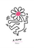 Dit schilderij toont een zwarte lijntekening van een persoon met grote bloemenhoofd met witte bloemblaadjes en een roze stip in het midden.