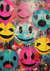 Dit schilderij toont een kleurrijk kunstwerk in graffiti-stijl met verschillende overlappende smileygezichten.
