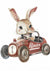 Dit schilderij vangt een konijn achter het stuur van een schattige, rode vintage auto, met een geconcentreerde blik en beide poten aan het stuur.