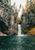 Een schilderij met een grote rots waaruit een prachtige waterval komt.