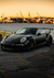 Dit schilderij toont een matzwarte Porsche GT3 RS geparkeerd in een haven tijdens zonsondergang, met scheepskranen zichtbaar op de zachte, oranje verlichte achtergrond. Het voertuig is voorzien van opvallende gele remklauwen en aerodynamische designelementen.