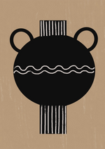 Een abstract zwart cirkelvormige kruik met twee handvatten op een beige achtergrond, met een gestreept patroon en een golvende horizontale lijn door het midden.