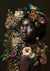 Dit schilderij toont een persoon met een donkere huidskleur en helderblauwe ogen, omringd door bloemen en groen. Naast haar staat een luipaard, ook versierd met bloesems, terwijl een kleurrijke vogel op haar hoofd zit te midden van het bloemenstilleven.