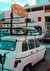 Een schilderij van een auto die een surfschool aanbiedt.