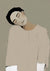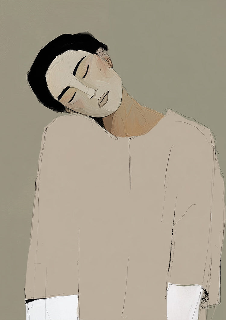 Een minimalistisch portret van een vrouw met gesloten ogen, leunend op haar schouder.