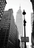 Zwart-wit schilderij van een stadsstraat die naar het Empire State Building leidt, met op de voorgrond een prominente straatlantaarn en een bord.