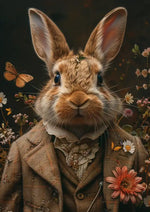 Op dit schilderij zie je een digitaal geïllustreerde afbeelding van een konijn, gekleed in een vintage-stijl pak compleet met een vlinderdas. Het konijn staat rechtop, omringd door bloemen en vlinders, met een gedetailleerde vacht en expressieve ogen.