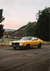 Dit schilderij toont een vintage auto met een zwart dak geparkeerd op een onverharde weg, omgeven door weelderig groen en heuvels tijdens de schemering.