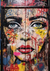 Dit schilderij toont eeneen vrouwengezicht met expressieve ogen met verschillende levendige graffiti-tags en verfdruppels.