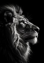 Dit schilderij toont een zwart-wit profielportret van een leeuw met manen, naar de zijkant kijkend. De afbeelding benadrukt de gedetailleerde gelaatstrekken en manen van de leeuw tegen een donkere achtergrond.